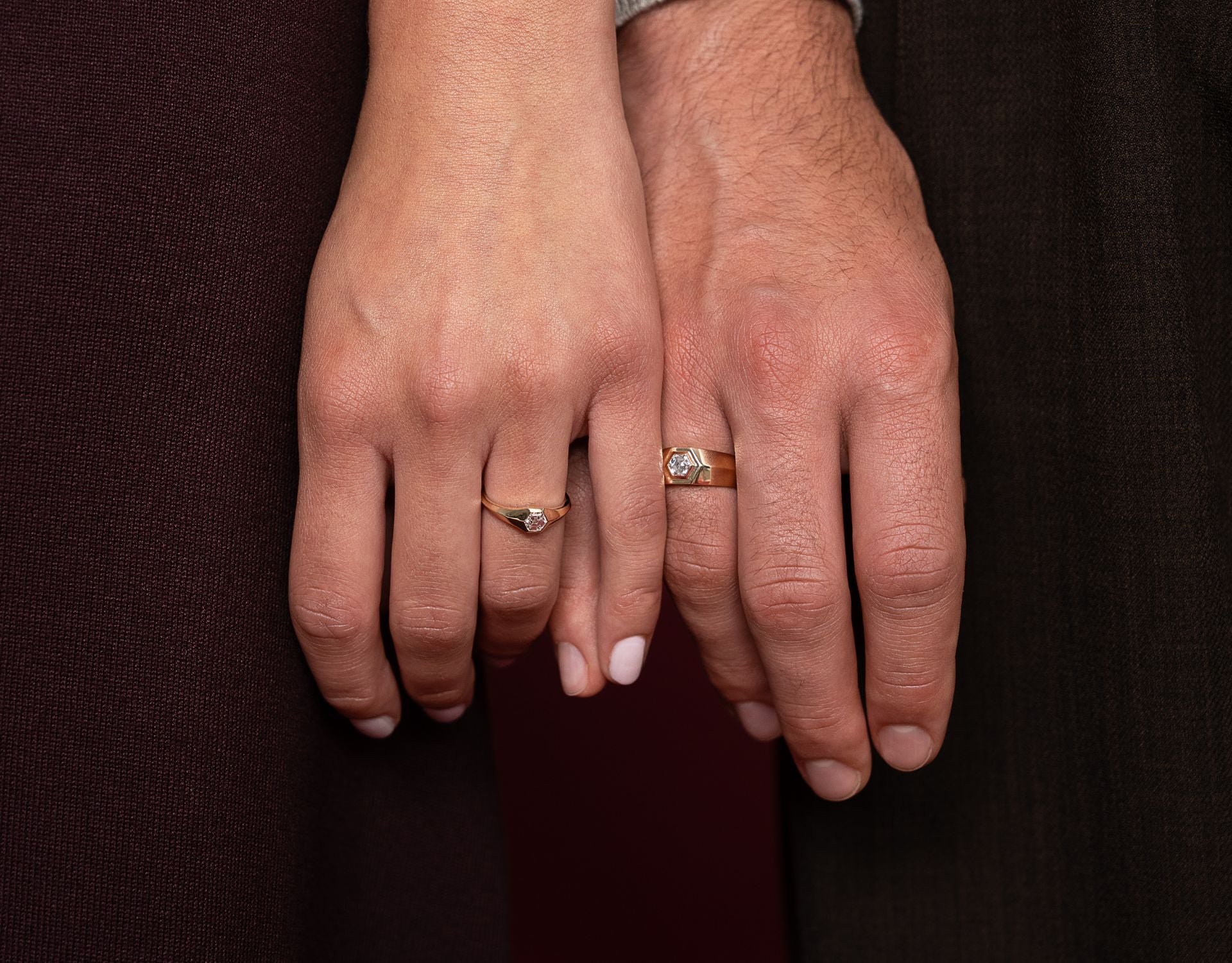 NEUVergoldeter Unisex Silberarmreif in Gelb mit Lab Diamanten im Princess und Emerald SchliffNahaufnahme Arm mit vergoldetem Silberschmuck mit Lab Diamanten an Handgelenk und Finger