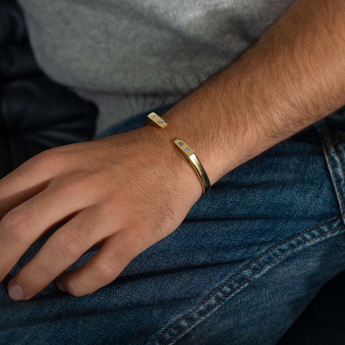 NEUVergoldeter Unisex Silberarmreif in Gelb mit Lab Diamanten im Princess und Emerald SchliffNahaufnahme Arm mit vergoldetem Silberschmuck mit Lab Diamanten an Handgelenk und Finger