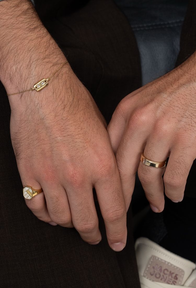 Zwei Ringe trägst du entweder direkt nebeneinander an einem Finger oder verteilt auf verschiedene Finger. Beim Tragen an einem Finger sollte der schmalere Ring als Basis dienen und mit einem Statement-Ring ergänzt werden – alternativ funktionieren auch zwei gleich breite Ringe für einen kraftvollen Look.