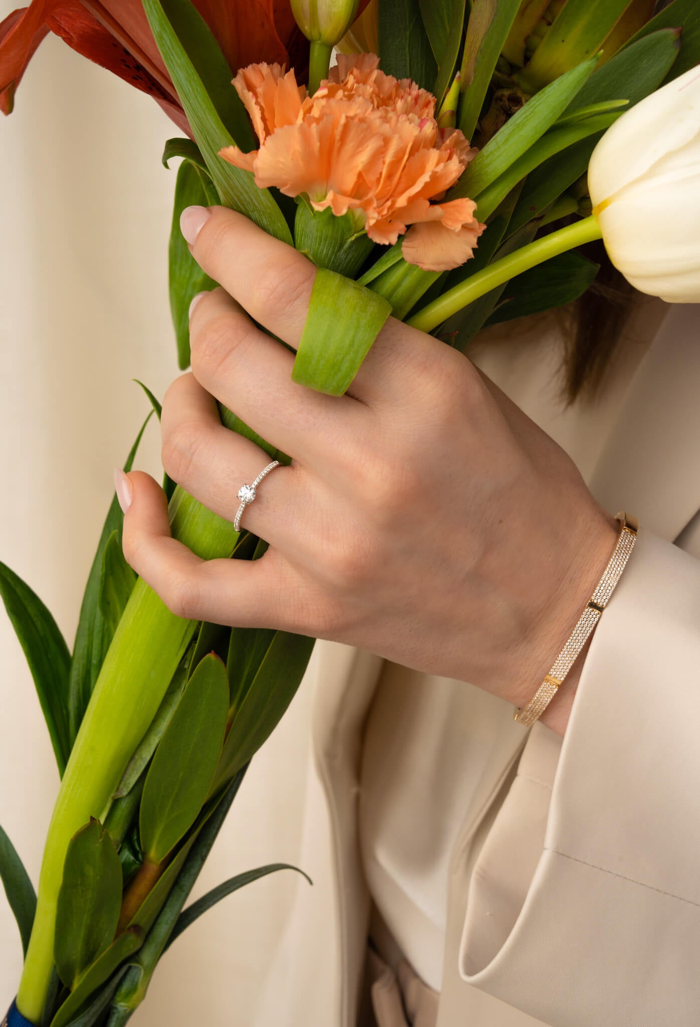 Die Wahl eines Rings aus Gelb- oder Roségold lässt dir die Wahl des Goldkarats. Karat bezieht sich auf die Reinheit des Goldes selbst, wobei 24 Karat am reinsten ist, da 24/24 Teile des Ringes aus reinem Gold bestehen. 18 Karat (750er) bedeutet also, dass 18/24 Teile oder 75% reines Gold sind, während der Rest die Legierung ist. 14 Karat (585) sind also 14/24 Teile oder 58,5% reines Gold. In der Legierung werden u.a. Silber und Kupfer für die Farbe und Festigkeit des Goldes hinzugemischt. Das Goldkarat hat auch einen direkten Einfluss auf den Farbton des Ringes. Je reiner das Gold ist, desto intensiver wird der Farbton oder die Farbe des Gelbs. Wie in unserem Leitfaden für Eheringe erläutert, geht ein hellerer Farbton oft besser mit einem schöneren Farbton einher. Die folgende Tabelle gibt dir einen guten Vergleich der möglichen Optionen für die Wahl des geeigneten Goldkarats.