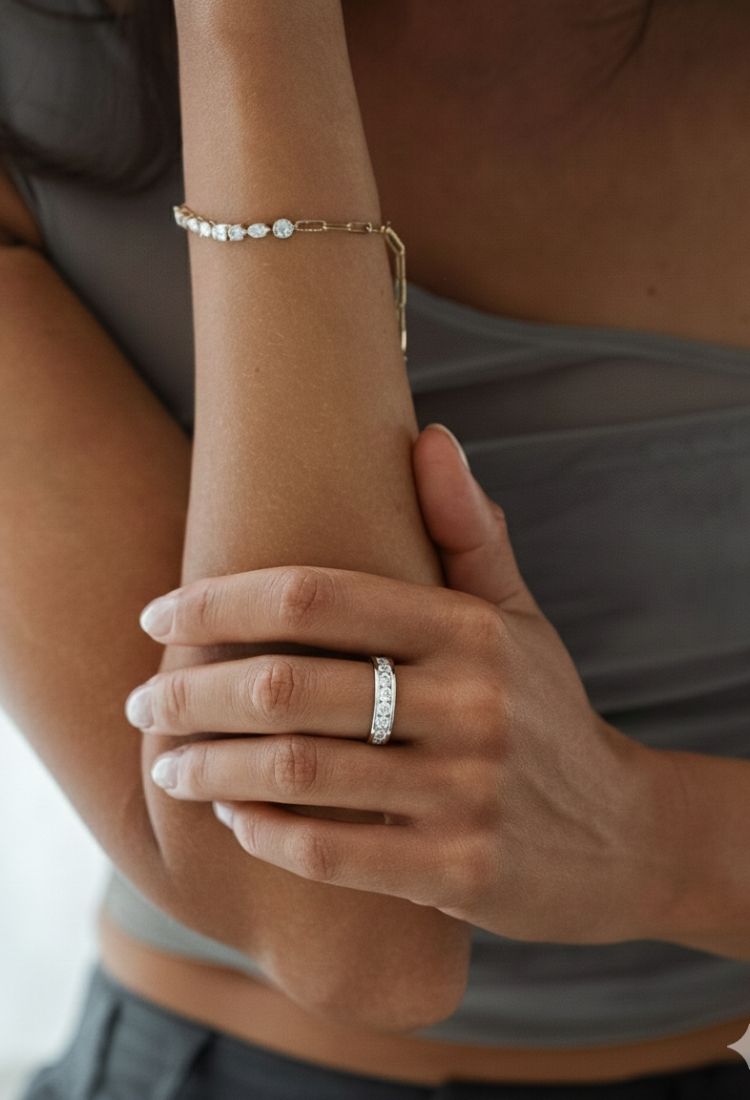 The channel setting really comes into its own in rings where several diamonds or gemstones are set harmoniously next to each other. Eternity rings, memoir rings or modern wedding rings benefit greatly from this style. It also looks extremely elegant in bracelets or clearly structured earrings, and in combination with gold, silver or platinum, it creates pieces of jewelry that are robust, modern and stylish at the same time. The setting is particularly popular in collections that focus on a clear design language, as the precious metal and the stones merge into a flowing unit. Depending on design preferences, the channel setting can be perfectly combined with other types of setting or used as the central element for a unique piece of jewelry, and the stability of a channel-set ring is reliably maintained even if the size of the ring changes - a major advantage over more delicate settings.