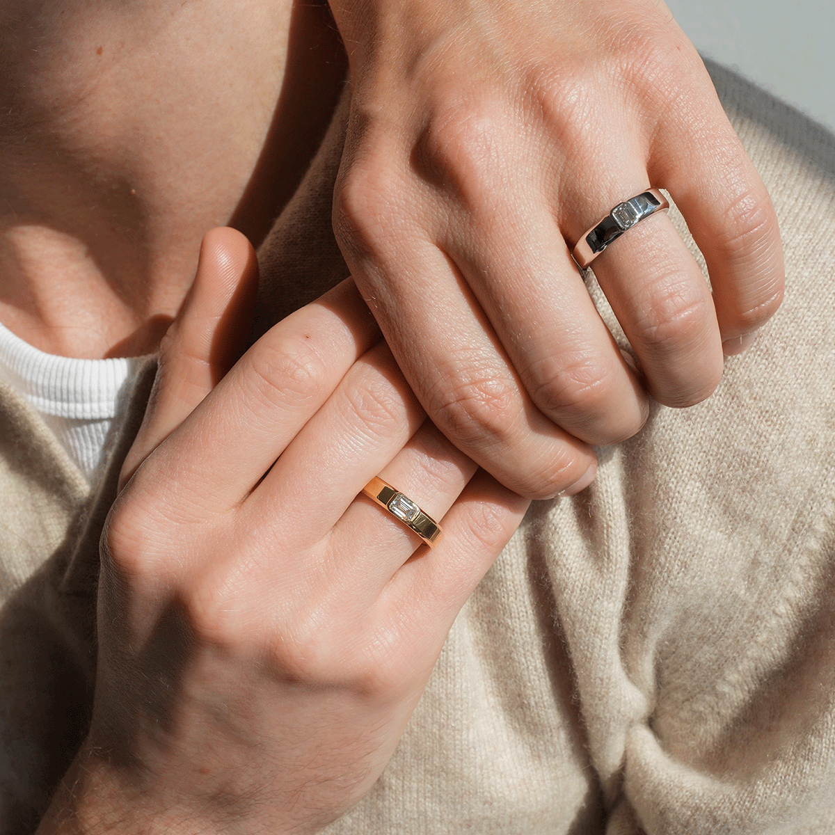 The first step in choosing a wedding ring material is to choose between platinum and gold. There are essentially two options on which to base the decision: Color and budget. Choose a color for your wedding band that matches your shade. Bolder colors like 18k (750) yellow/rose gold often look better if you have a stronger complexion, and lighter colors like 14k (585) yellow/rose gold go beautifully with paler or lighter complexions. However, at the end of the day, it's all about feeling comfortable with the color. We also recommend matching the material of the wedding band to the engagement ring if both rings are worn on the same hand. Traditionally, different cultures and countries have different customs regarding the hand on which the wedding ring is worn. In Germany, India, Norway and Poland, for example, the wedding ring is traditionally worn on the right hand. In Italy, Great Britain, France and most American countries, wedding rings are worn on the left hand. But: none of this is a must today, you decide! If you decide on the color white for the wedding ring, we recommend considering platinum. Platinum is the most valuable material and platinum is stronger than gold. Unlike white gold, it retains its color. White gold turns a little yellow with age. This looks great if you like this effect, but is important to know to avoid surprises. You can find more information about the advantages and disadvantages of wedding ring materials in our material guide.