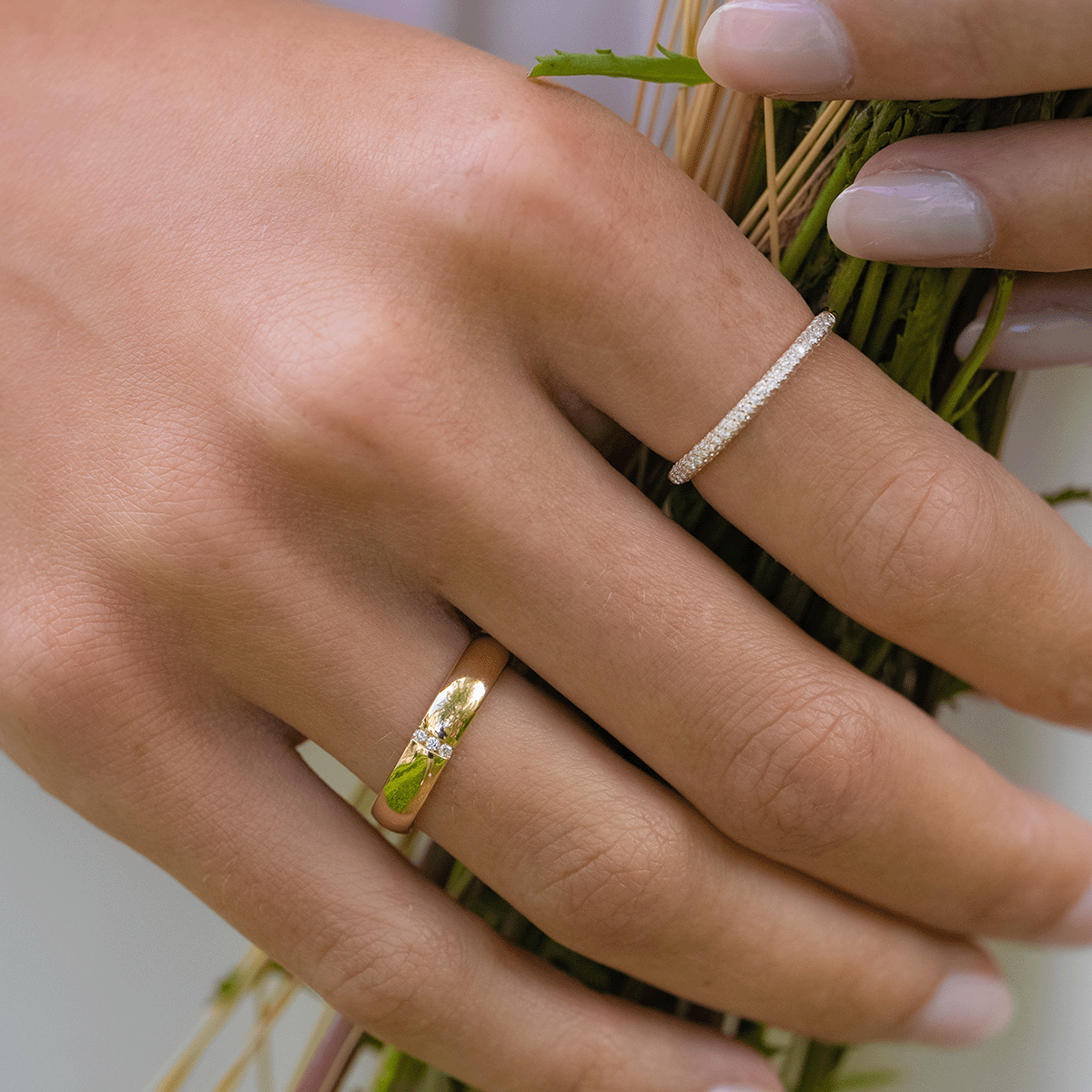- Price: a diamond-set wedding ring is more expensive. The material costs are also different, which we will discuss below.