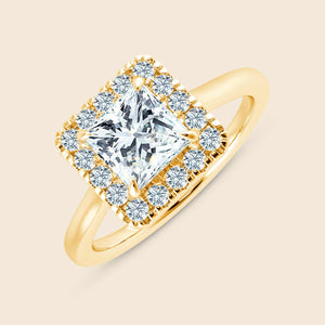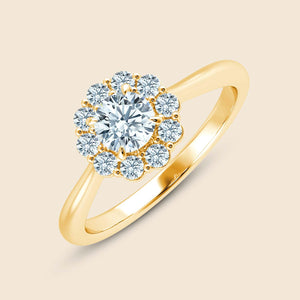 A halo engagement ring is a ring in which a central diamond or gemstone is surrounded by a ring of smaller diamonds. This "halo" enhances the sparkle of the main stone and makes it appear larger.