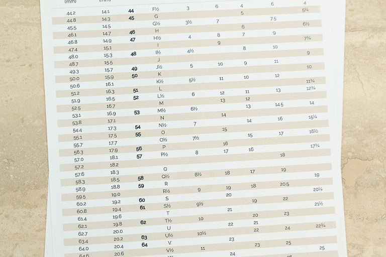 Step 4: Now you just need to find the value in millimeters in the size chart (see below). For example, a circumference of 58.3 mm would correspond to a European ring size 58.