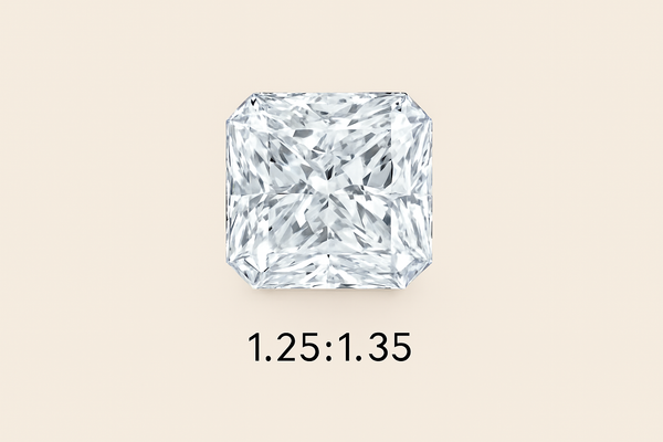 Proportion and symmetry are of crucial importance in the radiant cut. The ideal ratio of length to width varies depending on the desired shape: For rectangular radiant diamonds, a ratio of 1.15 to 1.35 is recommended, while square radiants should have a ratio below 1.05. Longer ratios give the radiant cut an elegant, slender look and make the stone appear larger, while shorter ratios show more sparkle and fire. When assessing the quality, make sure that the corners are evenly blunted and that the sides are parallel. Stones with excessively truncated or unevenly cut corners should be avoided, as these appear misshapen. The table should ideally be between 61 and 69 percent, while the depth should be between 61 and 67 percent to ensure optimum light reflection.