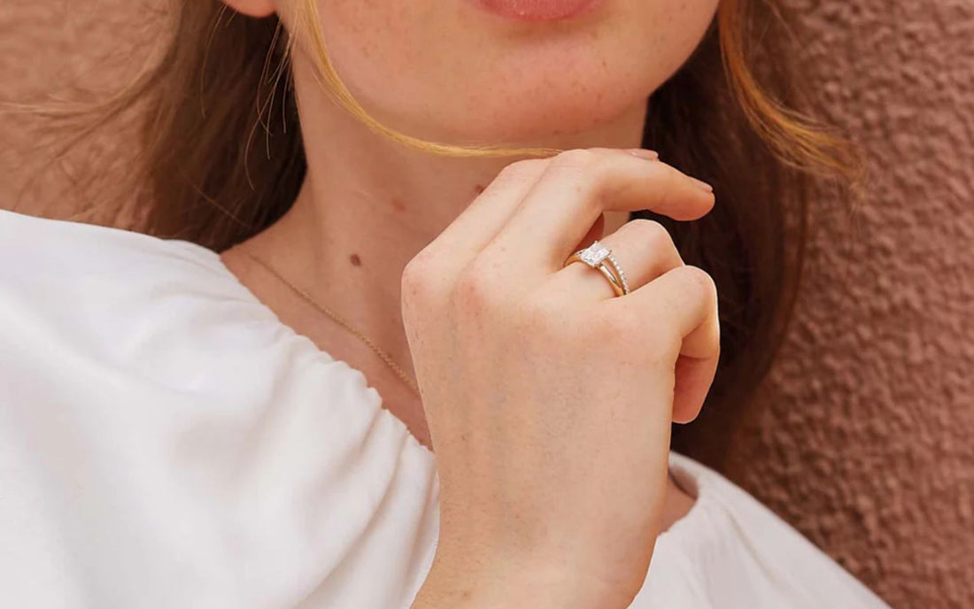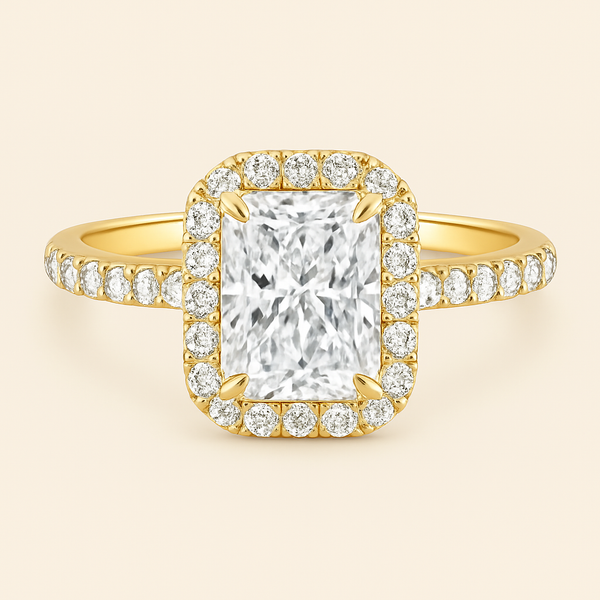 Another stylish option for radiant diamonds is the halo setting, in which smaller diamonds frame the rectangular or square main stone. This arrangement enhances the brilliance and makes the central radiant cut look even more impressive. The halo emphasizes the geometric shape of the radiant cut and gives the ring additional sparkle. Especially with elongated radiants, a halo setting creates an elegantly elongated look that visually lengthens the fingers.