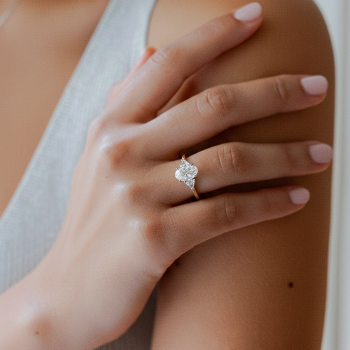 An example: 1 ct lab diamond with trillion accent in the gold engagement ring shows how a small trillion stone is used as a side stone in an engagement ring. The sharp corners and precise cut enhance the play of light and make the ring particularly elegant and expressive.