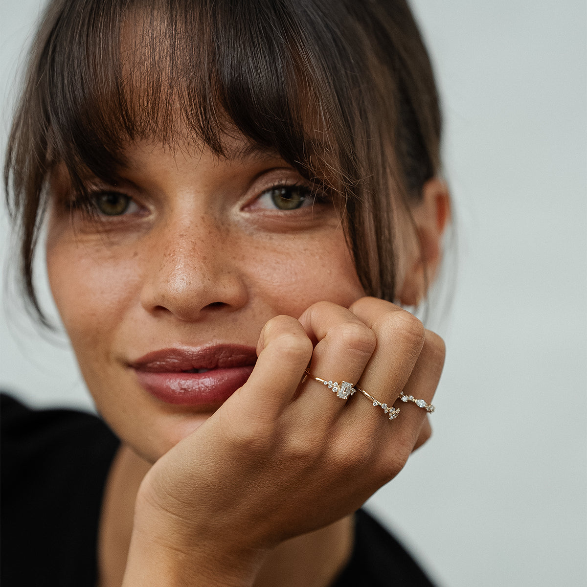 Stücke unserer Fine Linie werden in Handarbeit aus 100% recyceltem 14k Gold gefertigt. Sie sind nickelfrei und werden nach Bedarf rhodiniert. Unser Roségold ist nano-beschichtet, um den natürlichen Oxidationsprozess zu verlangsamen. Anschließend werden sie mit natürlichen Diamanten aus zertifizierten Minen besetzt. Diese werden von uns beschafft, geschliffen und verarbeitet. Sie haben eine Diamantqualität von SI | GH, es sei denn, sie werden individuell angepasst.