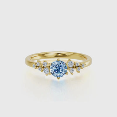 Der handgefertigte Blue Stardust Round Ring ist ein Einzelstück und ist von feinem Sternenstaub inspiriert. Kleine Diamanten verzieren das Ringband in unregelmäßiger Art und betonen den zentralen, blauen Diamanten, welcher wie ein hell strahlender Sternenhimmel auf dem 14k Gelbgold leuchtet. Das Model trägt Größe 54.